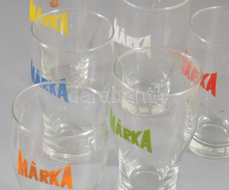 Márka 6 darab retro üdítős pohár, különböző színű feliratokkal, eredeti dobozában, hibátlan, m: 12 cm