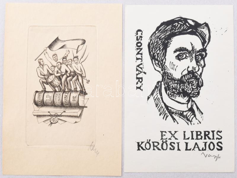 2 db ex libris: Varga Nándor Lajos (1895-1978): Ex libris Kőrösi Lajos. Fametszet, papír, jelzett. 12x7 cm és Nagy Árpád Dániel (1922-1985): Ex libris Losonczi Pál. Rézkarc, papír, jelzett, 11x6 cm.