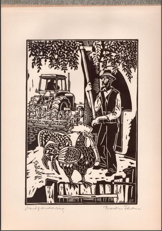 Beschreibung: Bodri Ferenc (1943-2021): Mezőgazdaság. Linómetszet, papír, jelzett, 29x20 cm