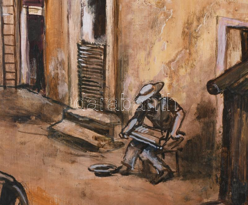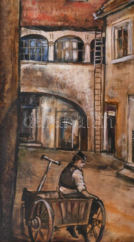 Beschreibung: Jálics Gyula (1940-2016): Soproni udvar. Olaj, farost, jelzett. Fakeretben, 70×50 cm.