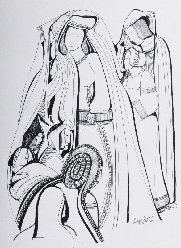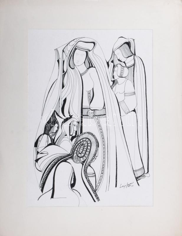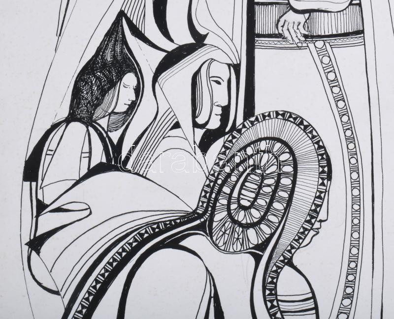 Beschreibung: Lajos Ferenc (1912-1998): Jelenet, 1984. Tus, papír, jelzett. 37x27 cm. Paszpartuban.