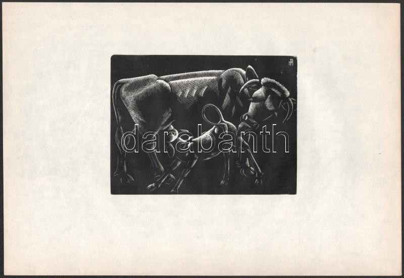 Beschreibung: Patay Mihály (1910-1956): Tehén bocival, 1930-as évek. Fametszet, papír, jelzett a metszeten, 11x14,5 cm