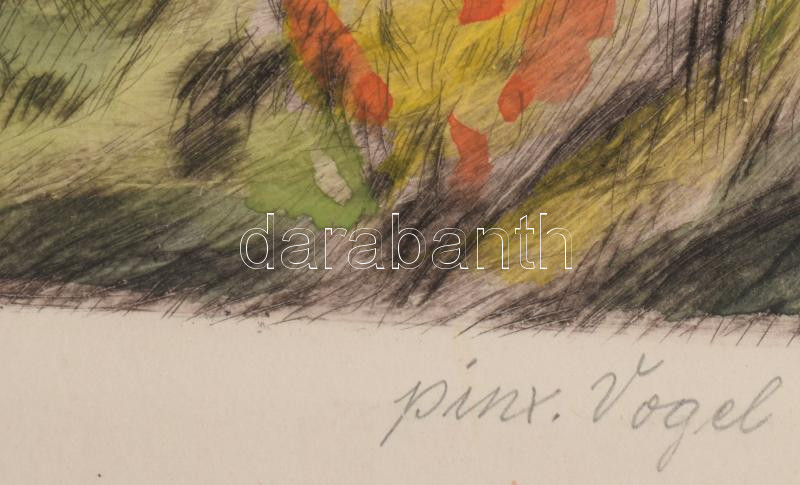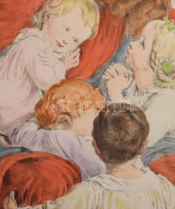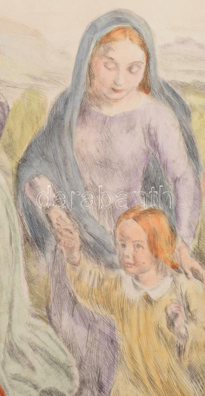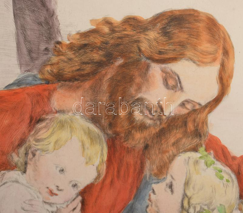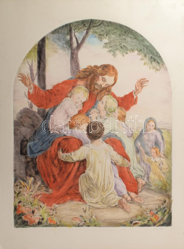 Beschreibung: Prihoda István (1891-1956), C. Vogel pinx: Engedjétek hozzám... (Jézus gyerekekkel). Színezett rézkarc, papír, jelzett (Vogel pinx). Lapszéli elszíneződésekkel és kisebb szakadással. 63×48 cm.