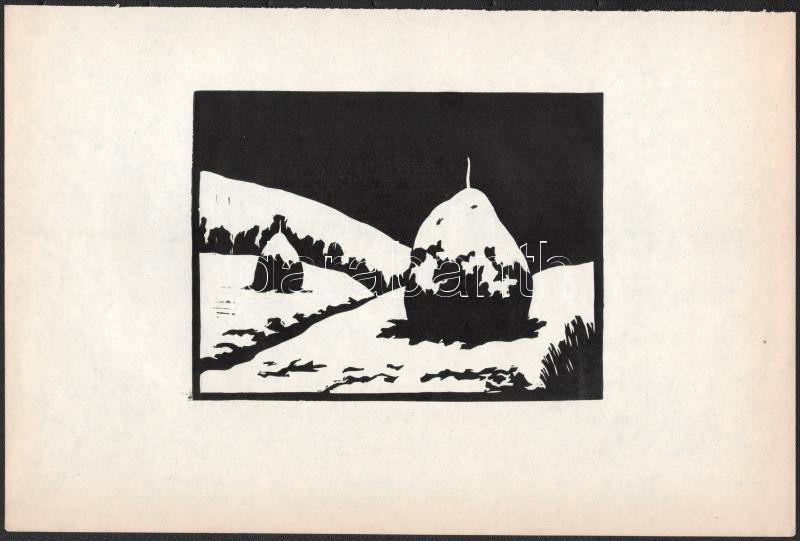 Beschreibung: Schilling János (1930-31-ben a nagybányai szabadiskolában tanult): Szénaboglyák, 1930-as évek. Linómetszet, papír, jelzés nélkül, 12x16 cm