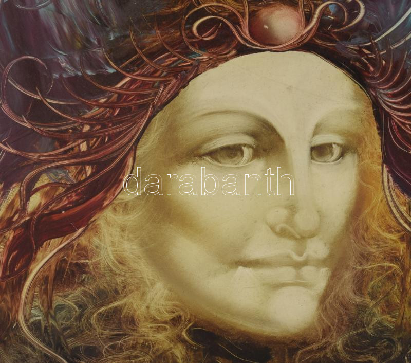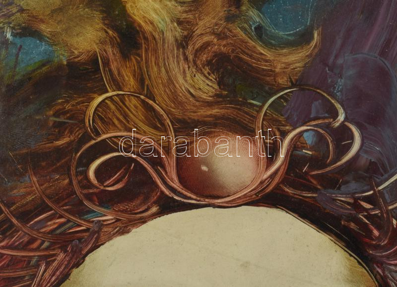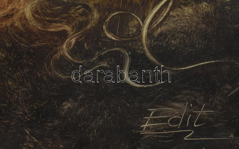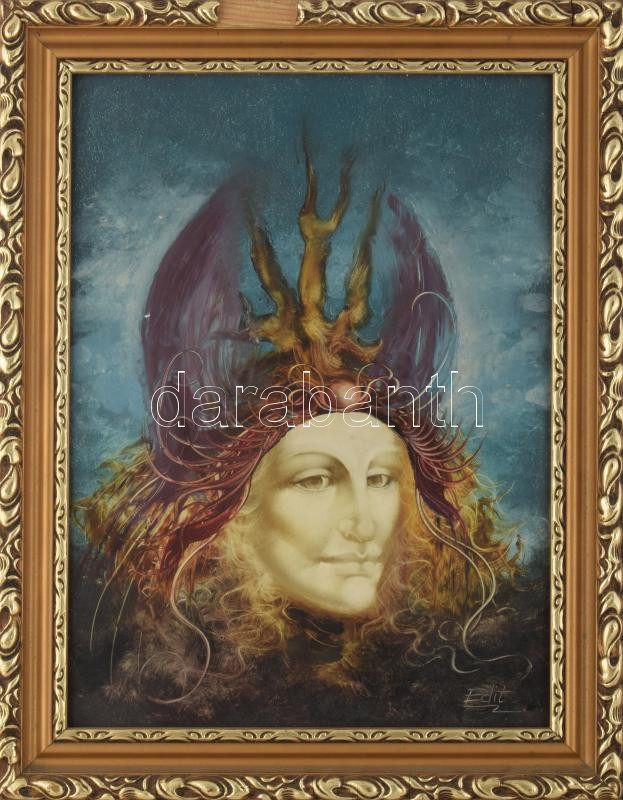 Edit jelzéssel: Női szürrealista portré. Olaj, farost. Dekoratív, sérült fakeretben, 40×30 cm