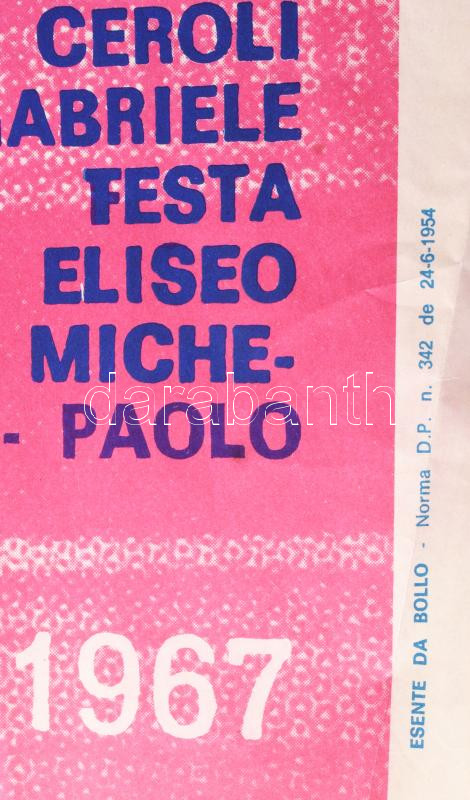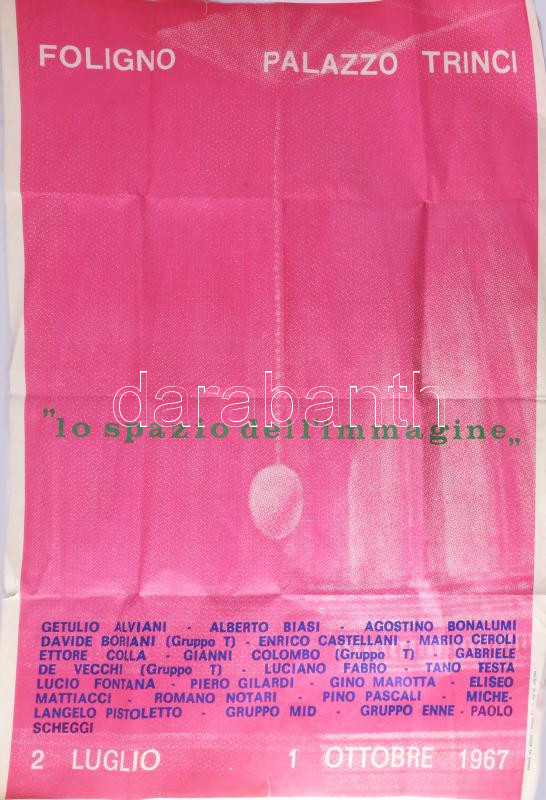 Beschreibung: 1967 "Lo spazio dell'immagine" (Getulio Alvani, Alberto Biasi, Enrico Castellani, Lucio Fontana stb.). Foligno, Palazzo Trinci. Olasz kiállítási plakát. Hajtásnyomokkal. Lapszéli kisebb szakadással. 100x70 cm