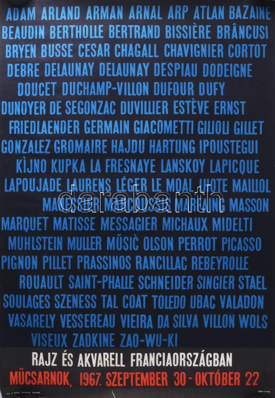 1967 Rajz és akvarell Franciaországban, Műcsarnok (Arp, Chagall, Delaunay, Ernst, Giacometti, Hajdu, Hartung, Picasso, Vasarely stb.). Killítási plakát, ofszet,, papír. Jelzés nélkül. Offset-nyomda. Feltekerve. Lapszéli kisebb szakadásokkal. 68×47 cm