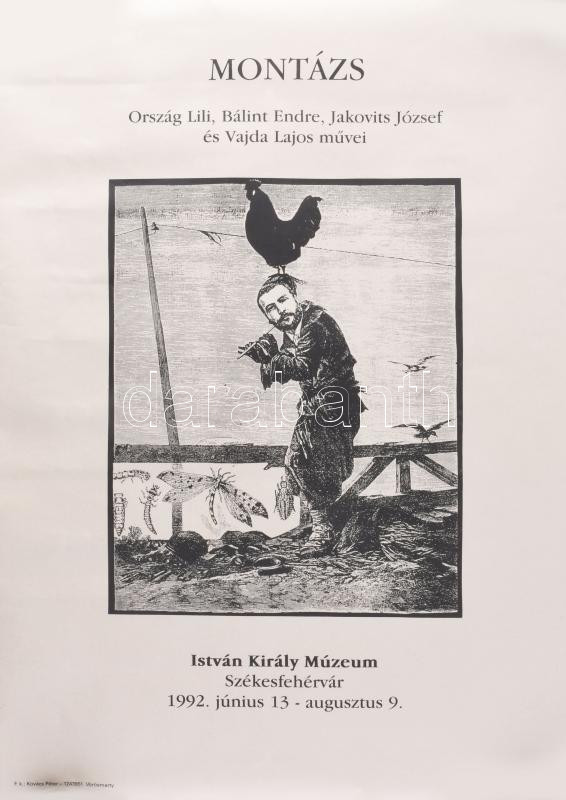 1992 Montázs, Ország Lili, Bálint Endre, Jakovits József és Vajda Lajos művei, István Király Múzeum, SZékesfehérvár, kiállítási plakát, papír, Vörösmarty Nyomda, jelzés nélkül, feltekerve, apró lapszéli szakadással. 58,5x41,5 cm