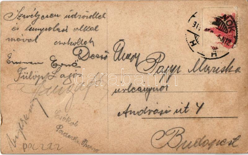 1911 Férfiak söröskorsókkal és hordóval / men with beer mugs and barrel. photo