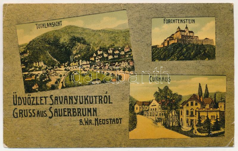 1915 Savanyúkút, Bad Sauerbrunn; Totalansicht, Forchtenstein, Curhaus. Franz Pomper / látkép, Fraknó vára, fürdő / view, castle, spa (ázott / wet damage)