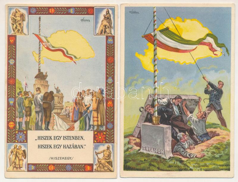 5 db RÉGI megíratlan magyar irredenta képeslap: Trianon, Országzászló, Hiszek Egy. Kiadja az Ereklyés Országzászló Nagybizottsága / 5 pre-1945 postcards: Hungarian irredenta propaganda, Hungarian flag, Treaty of Trianon