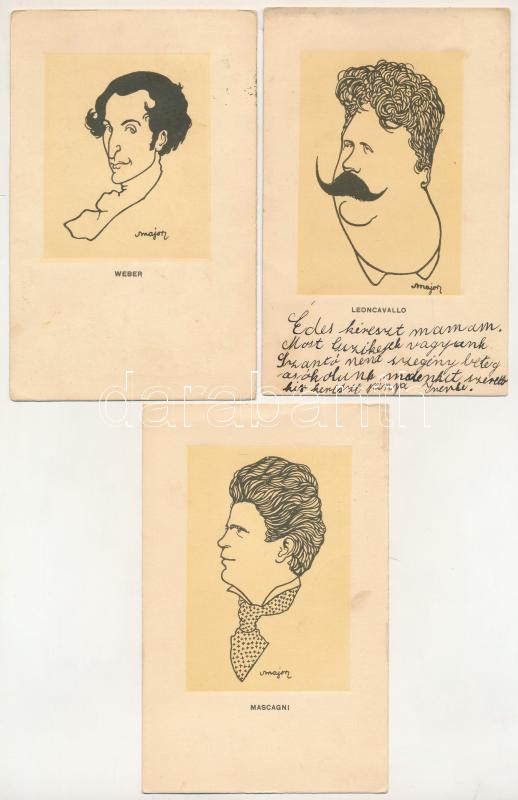 Zeneszerzők karikatúrái - 3 db RÉGI levelezőlap Major Henrik rajzai után. Nyomtatta és kiadta Kner Izidor, Gyoma. / Caricatures of composers - postcard series with 3 pre-1945 postcards