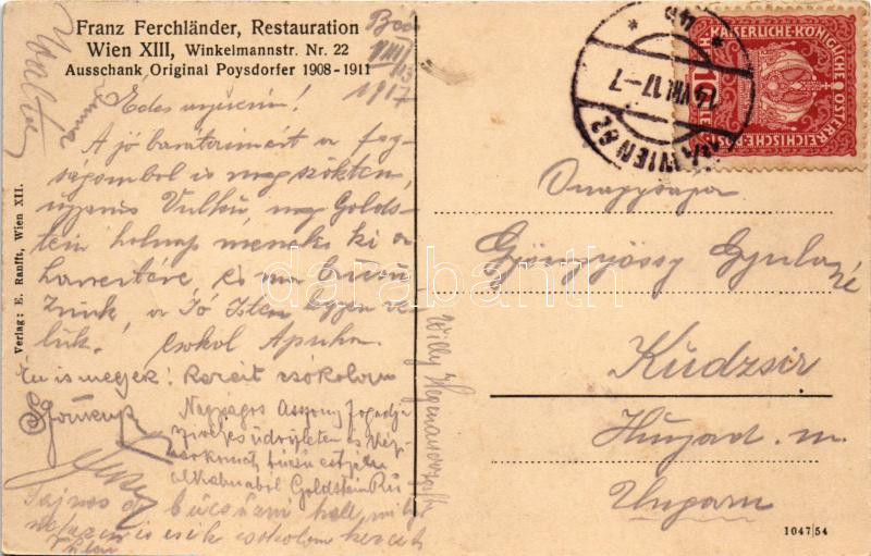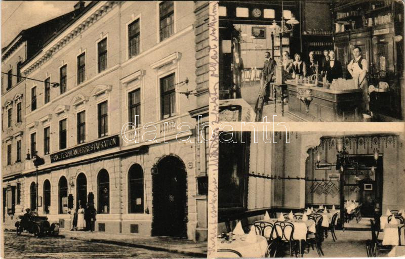 1917 Wien, Vienna, Bécs; Franz Ferchländer Restauration. Winkelmannstr. Nr. 22. Ausschank Original Poysdorfer 1908-1911 / restaurant, automobile, interior with the staff
