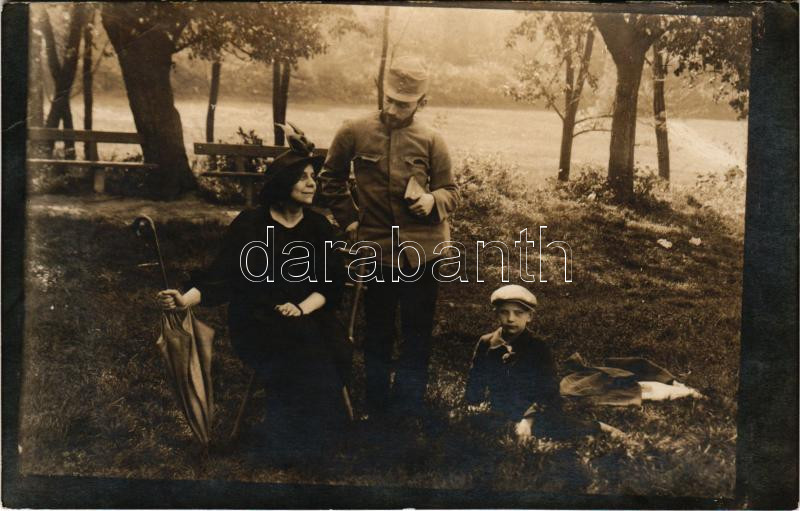 Kaffka Margit (1880-1918) a magyar irodalom egyik legjelentősebb női írója, a Nyugat nemzedékének fontos tagja férjével, Fröhlich Brunóval és fiával, Lászlóval. 1918 őszén az írónő és 12 éves fia a spanyolnátha járvány áldozata lett. photo (vágott / cut)
