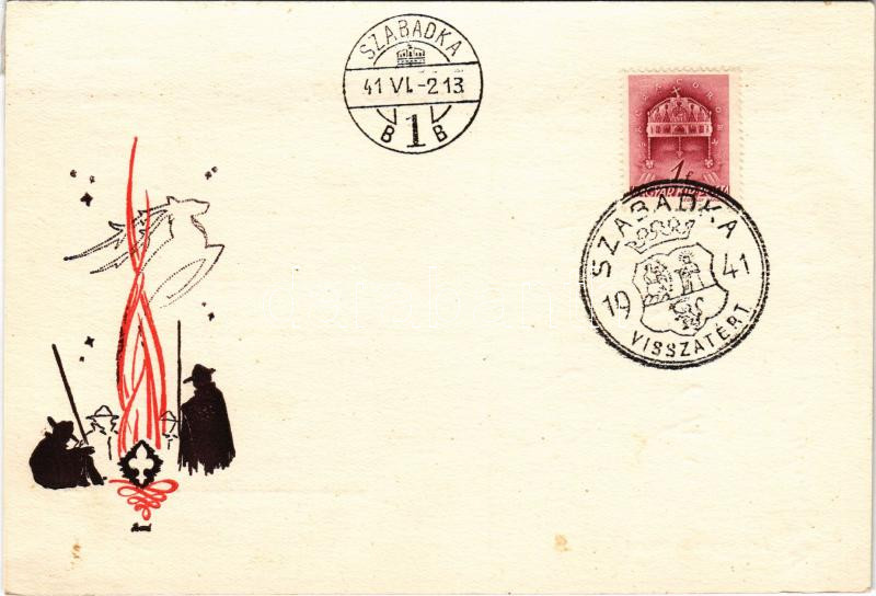 1941 Magyar cserkész művészlap / Hungarian boy scout art postcard s: Bozó + "1941 Szabadka visszatért" So. Stpl. (r)