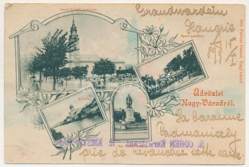 1899 Nagyvárad, Oradea; Szent László templom, piac, Sportpavilon, Körös part, zsinagóga, Szent László szobor. Pauker Dániel kiadása, szecessziós-virágos keret / church, market, sport pavilion, Cris riverside with synagogue, statue. Art Nouveau, floral frame (b)