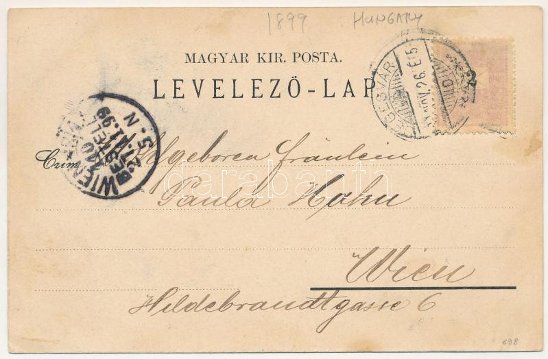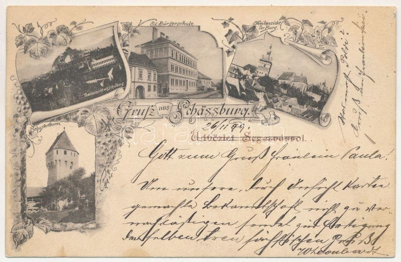 1899 Segesvár, Schässburg, Sighisoara; Teilansicht mit Schulberg, Ev. Bürgerschule, Teilansicht der Burg, Schusterturm / Evangélikus iskola, vár, Cipészek tornya. Szecessziós-virágos keret / Lutheran school, castle, tower. Art Nouveau, floral (fl)