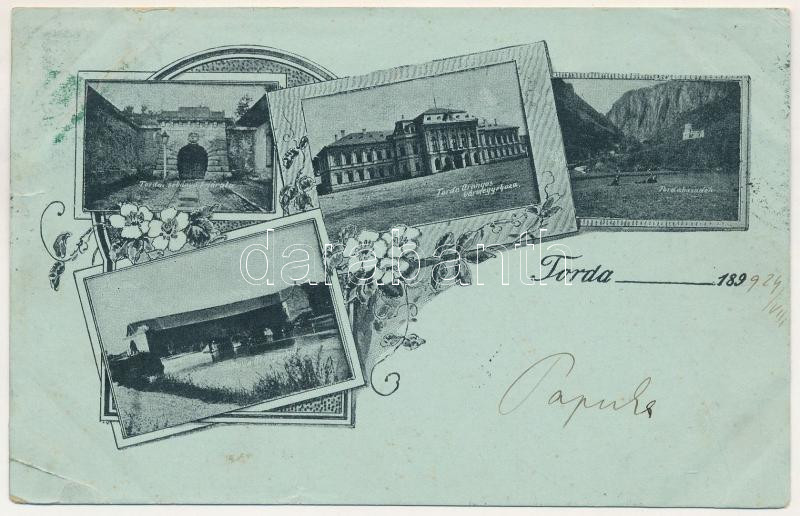 1899 Torda, Turda; Torda-Aranyos vármegyeháza, sóbánya bejárata, híd, Tordai hasadék / Turda-Aries county hall, salt mine, bridge, mountain pass, gorge. Art Nouveau, floral (ázott / wet damage)