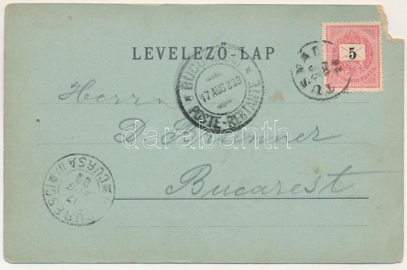 1899 Tusnádfürdő, Baile Tusnad; vasútállomás, gőzmozdony, vonat, Stanescu villa, Konopasek villa este holdfényben. Adler A. / railway station, locomotive, train, villas at night in moonlight. Art Nouveau, floral (b)