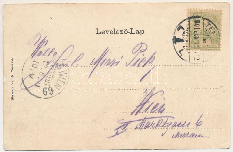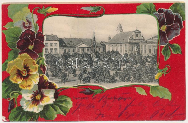 1901 Temesvár, Timisoara; Jenő herceg tér, Rukavina emlékmű. Uhrmann Henrik kiadása, szecessziós-virágos litho keret / square, monument. Art Nouveau, floral, litho frame (r)
