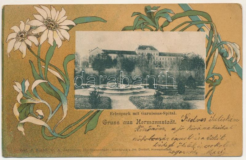 1902 Nagyszeben, Hermannstadt, Sibiu; Erlenpark mit Garnisons-Spital / Erlen park, Helyőrségi kórház. Szecessziós-virágos litho keret / park, K.u.K. military garrison hospital. Verl. G. A. Seraphin. Lichtdruck v. Jos. Drotleff Art Nouveau, floral, litho frame (EK)