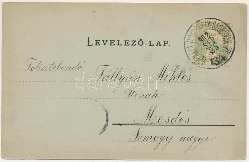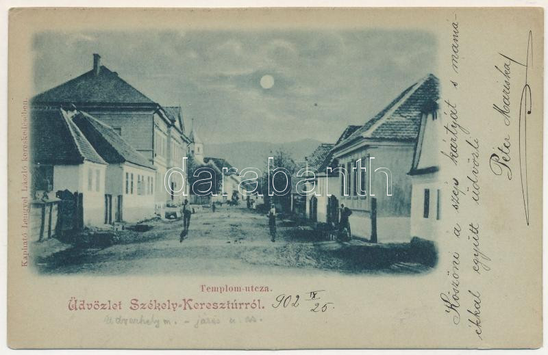 1902 Székelykeresztúr, Kristur, Cristuru Secuiesc; Templom utca este holdfényben. Lengyel László kiadása / street view at night in moonlight + SZÉKELYUDVARHELY - SEGESVÁR 134. SZ." vasúti mozgóposta bélyegző (kis szakadás / small tear)
