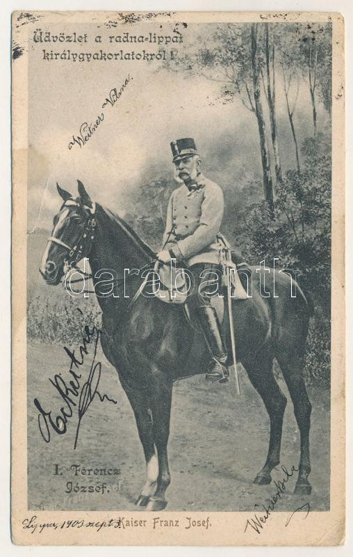 1903 Máriaradna, Mária-Radna, Radna (Lippa, Lipova); Üdvözlet a radna-lippai királygyakorlatokról! I. Ferenc József. Mária-Radna és Lippa vidékén megtartott királyi hadgyakorlatok emlékéül 1903. szeptember hó / In memory of the royal maneuvers and the presence of his Majesty the Emperor Franz Joseph I of Austria (fa)