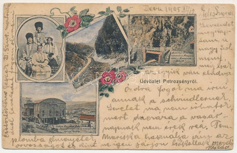1905 Petrozsény, Petrosani; Határhíd a Szurduk szorosban Magyarország és Románia között, Salgótarjáni kőszénbánya részvénytársaság szénosztályozó műve, iparvasút, Petrozsény vidéki oláhok. Szecessziós-virágos keret / Pasul Surduc, border bridge between Hungary and Romania, coal mine, coal classification plant, industrial railway, Transylvanian Vlach people. Art Nouveau, floral frame (EK)
