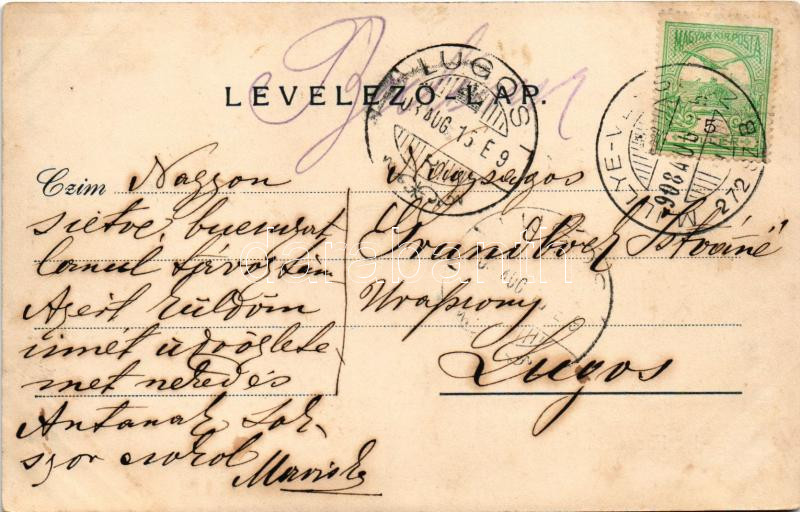 1908 Facset, Facsád, Faget; Adóhivatal. Deutsch Műintézete (Brád) kiadása / tax office + "M. ILLYE - VERSECZ 272. SZ. B" vasúti mozgóposta bélyegző (r)