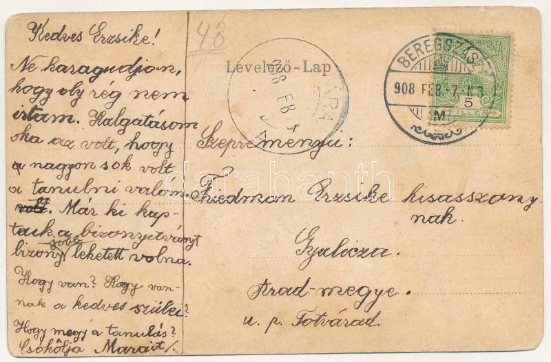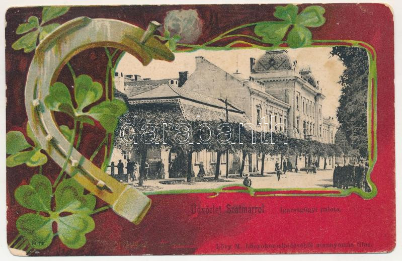 1908 Szatmárnémeti, Szatmár, Satu Mare; Igazságügyi palota. Lővy M. kiadása, szecessziós-lóherés litho keret patkóval / Palace of Justice. Art Nouveau, litho frame with clovers and horseshoe (kopott sarkak / worn corners)