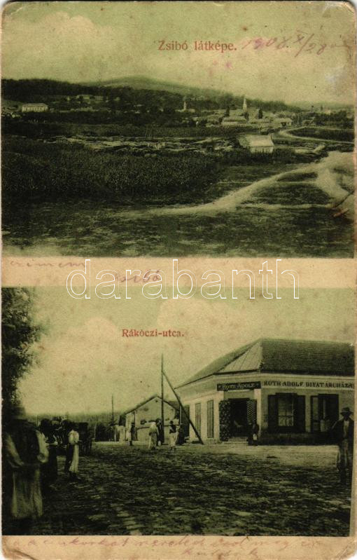 1908 Zsibó, Jibou; látkép, Rákóczi utca, Róth Adolf üzlete / general view, street, shop (EM)