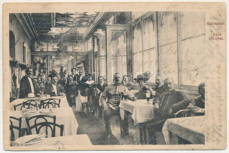 1914 Kolozsvár, Cluj; Rácz étterem, belső vendégekkel, katonával és pincérekkel. Zetán Péter kiadása / restaurant, interior with guests, K.u.K. soldier and waiters (ázott sarkak / wet corners)