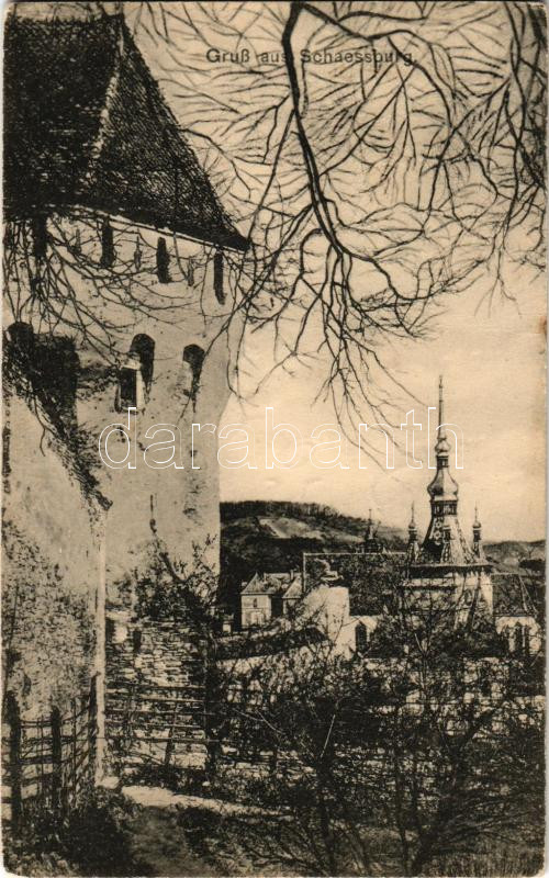 1917 Segesvár, Schässburg, Sighisoara; látkép, óratorony. Fritz Teutsch kiadása / general view, clock tower (gyűrődés / crease)