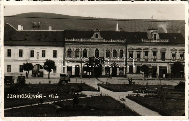 1940 Szamosújvár, Szamos-Újvár, Gherla; Fő tér, Elite étterem, Covrik Feodor, Florian Jacob üzlete / main square, restaurant, shop. photo + "1940 SZAMOSÚJVÁR VISSZATÉRT" So. Stpl
