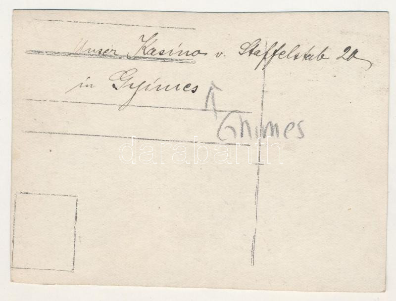 Csíkgyimes, Csík-Gyimes, Gyimes, Ghimes; Unser Kasino v. Staffelstab 20. / Német katonák a tiszti kaszinó előtt / WWI German military, officers' casino with soldiers. photo (10,6 cm x 7,7 cm) (vágott / cut)