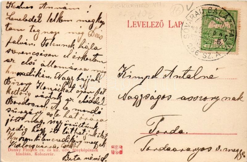 Dicsőszentmárton, Tarnaveni, Diciosanmartin; Unitárius templom, paplak és tanácsterem. Dunky Fivérek cs. és kir. udvari fényképészek kiadása / Unitarian church, rectory and office + "SÓVÁRAD - BALÁZSFALVA 266. SZ. A" vasúti mozgóposta bélyegző (kis szakadás / small tear)