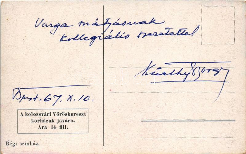 Kolozsvár, Cluj; Régi színház, grafikai lap a kolozsvári Vöröskereszt kórházak javára, Kürthy György (az alkotó) saját kezű levelével és aláírásával, Varga Mátyásnak dedikálva 1967-ben / old theater, graphic charity postcard, with signature and letter of the artist s: Kürthy (apró szakadás / tiny tear)