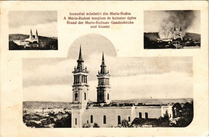 Máriaradna, Mária-Radna, Radna (Lippa, Lipova); A templom és kolostor égése, tűzvész / Incendiul manastiri din Maria-Radna / Brand der Maria-Radnaer Gnadenkirche und Kloster / burning of the church and monastery, fire. Edit. Nic. Beer. Photogr. Dr. B. Odor (fl)