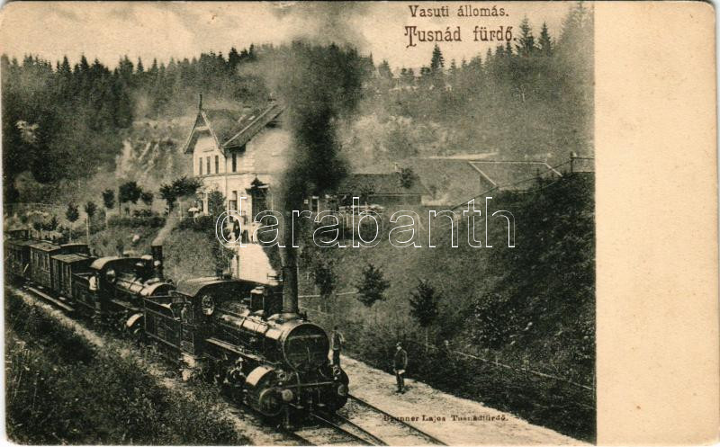 Tusnádfürdő, Baile Tusnad; vasútállomás, gőzmozdony, vonat. Brunner Lajos kiadása / Bahnhof / railway station, locomotive, train (EM)