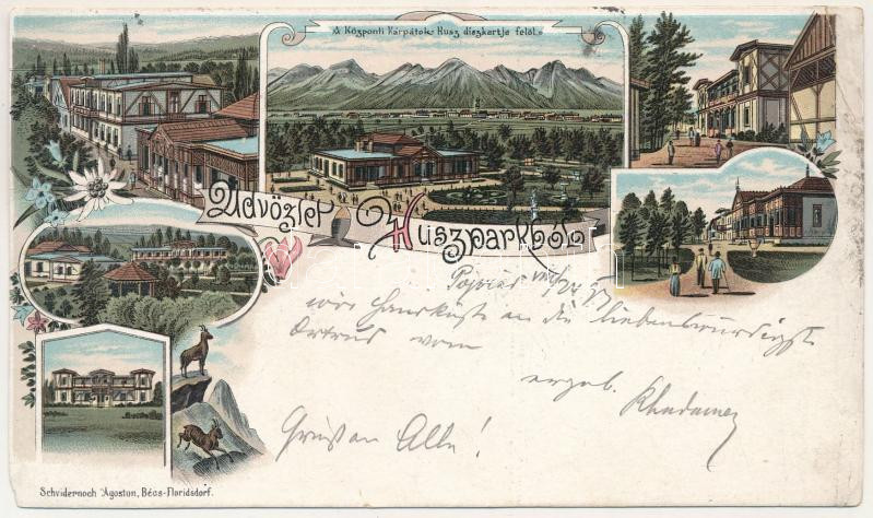 1897 Poprád (Tátra, Tatry); Üdvözlet a Huszparkból, kávéház, szállók és villák, Központi Kárpátok a díszkert felől. Schwidernoch Ágoston műintézete / café, villas, hotels, spa. Art Nouveau, floral, litho (EM)