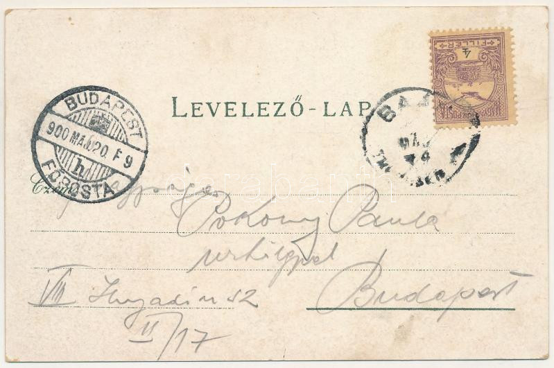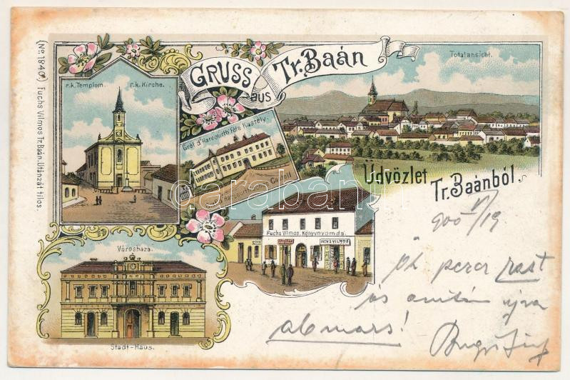 1900 Bán, Trencsénbán, Tr. Baán, Bánovce nad Bebravou; Római katolikus templom, városháza, Gróf d'Harcourt-féle kastély, Fuchs Vilmos könyvnyomdája, üzlete és saját kiadása / church, town hall, castle, publisher's shop. Art Nouveau, floral, litho (fl)