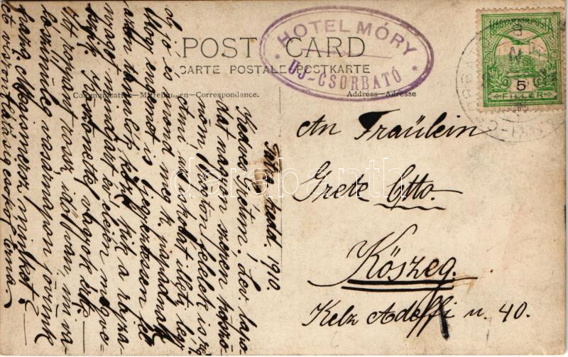 1910 Tátra, Magas-Tátra, Vysoké Tatry; Új Csorba tó, kirándulók / Nové Strbské Pleso, hikers. photo + "Hotel Móry Új-Csorbató" (fl)