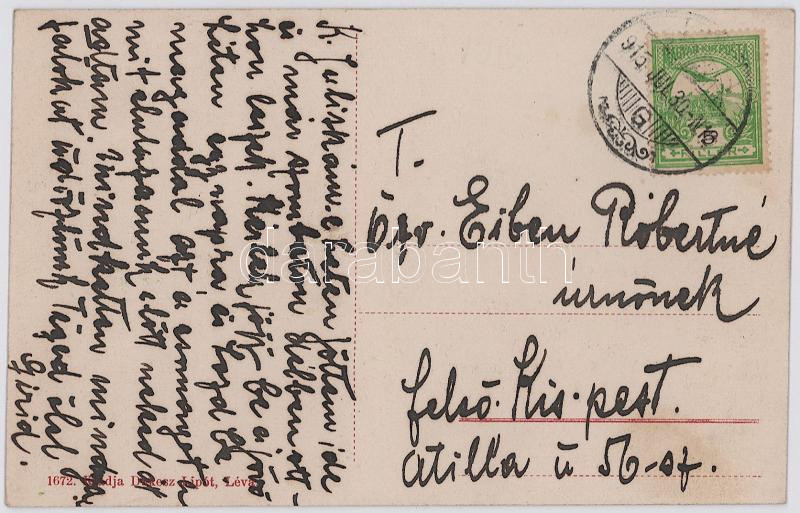 1915 Léva, Levice; Kossuth tér, Knapp Dávid, Bercsényi Gyula üzlete, gyógyszertár, Lévai Kereskedelmi Bank r.-t., Nagy Artúr fényképész műterme. Dukesz Lipót kiadása / square, shops, pharmacy, bank, photographer's atelier (fl)