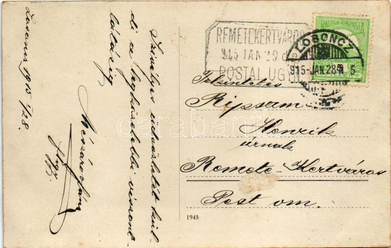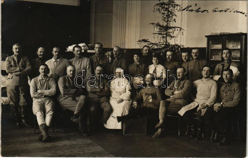 1915 Losonc, Lucenec; karácsony a katonai kórházban, sebesültek, nővérek csoportképe / Christmas in the K.u.k. military hospital, soldiers, nurses. photo + "REMETEKERTVÁROS POSTAI ÜGYN." (Rb)