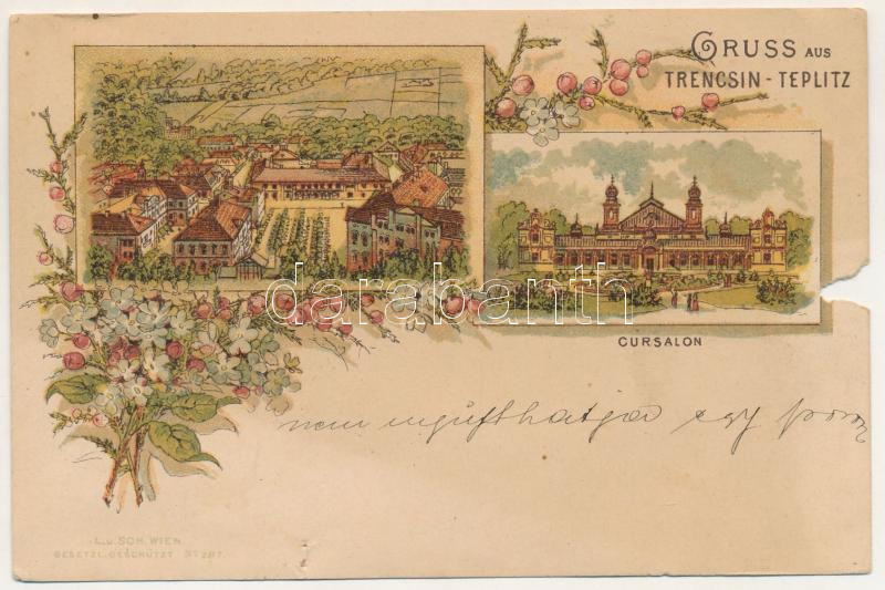 Trencsénteplic, Trencianske Teplice; látkép, gyógyterem / Cursalon / general view, spa. L. v. Sch. Wien Art Nouveau, floral, litho (b)