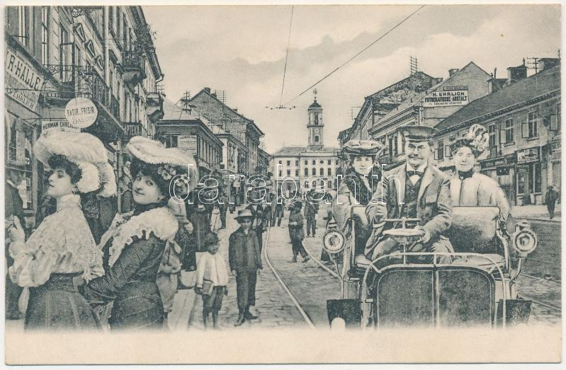 Chernivtsi, Czernowitz, Cernauti, Csernyivci (Bukovina, Bucovina, Bukowina); street view with shops, town hall. Montage with ladies, automobile and chauffeur (EK)