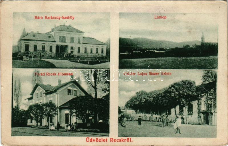 1917 Recsk, vasútállomás, Czisler Lajos fűszerüzlete, Báró Barkóczy-kastély, látkép. Brahacsek J. fia kiadása (ázott / wet damage)