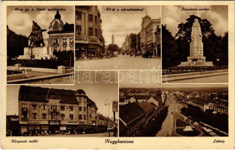 1937 Nagykanizsa, 48-as gyalogezred hősök emlékműve, Fő út, városháza, Grünfeld üzlete, kávéház, automobil, irredenta szobor, Központi szálloda, látkép (EK)