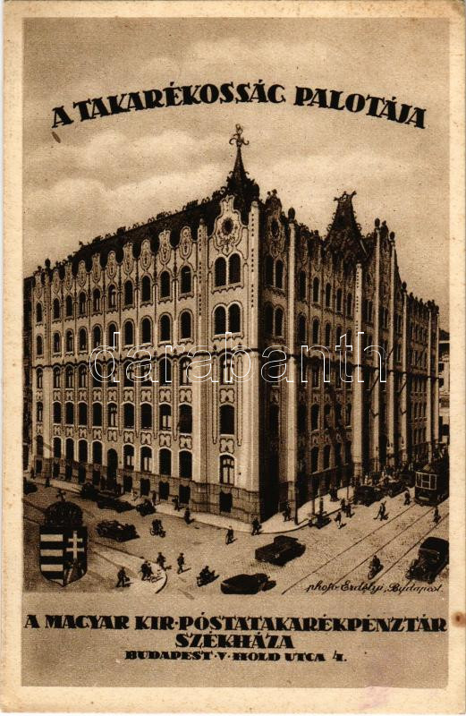 Budapest V. A Takarékosság palotája, Magyar királyi Posta Takarékpénztár székháza, villamos, automobil, magyar címer. Photo Erdélyi. Hold utca 4. (ázott sarok / wet corner)