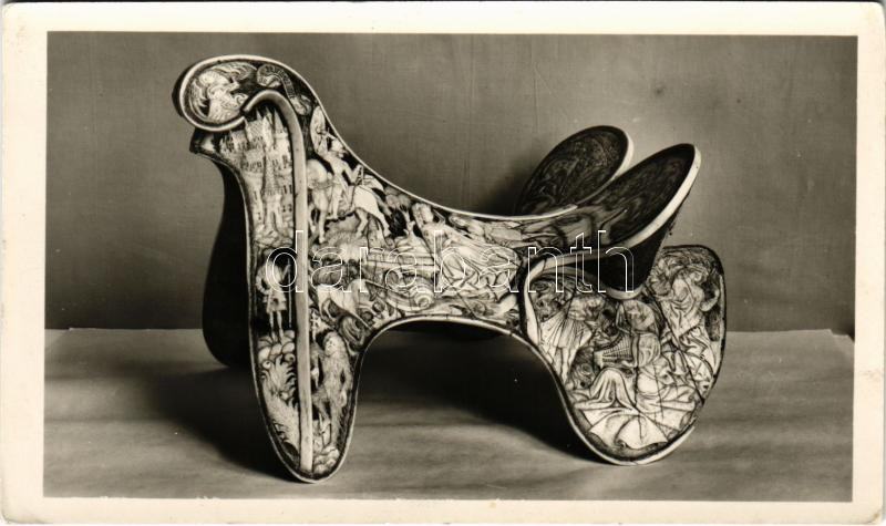 Budapest VIII. Magyar Nemzeti Múzeum Történeti Múzeuma, elefántcsontborítású dísznyereg faragványain a lovagvilág jeleneteivel, flandriai munka Zsigmond király korából. Képzőművészeti Alap Kiadóvállalat (EK)